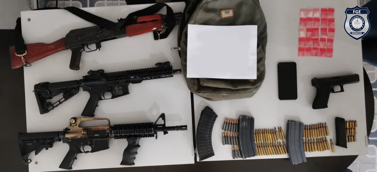 Agentes de Investigación Criminal (AIC) de la Fiscalía Regional Sur Poniente lograron la detención flagrante de cuatro presuntos integrantes del grupo delictivo “Los Colombianos”, a quienes les decomisaron vehículos, armas largas y cortas, droga, cartuchos y chalecos tácticos.