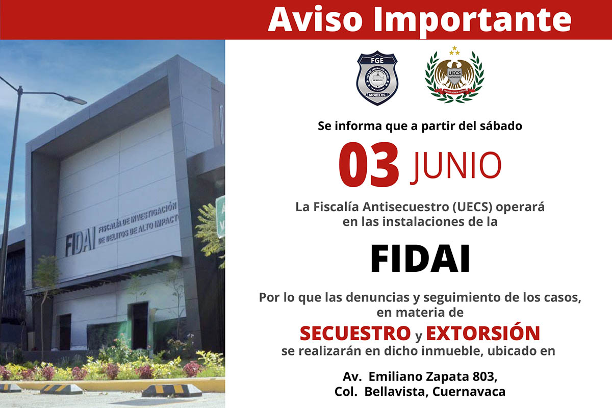 Se informa a la sociedad que a partir del sábado 03 de junio del presente año, la Fiscalía Especializada para el Combate al Secuestro y Extorsión (UECS) brindará servicio en las instalaciones de la Fiscalía de Investigación de Delitos de Alto Impacto (FIDAI).