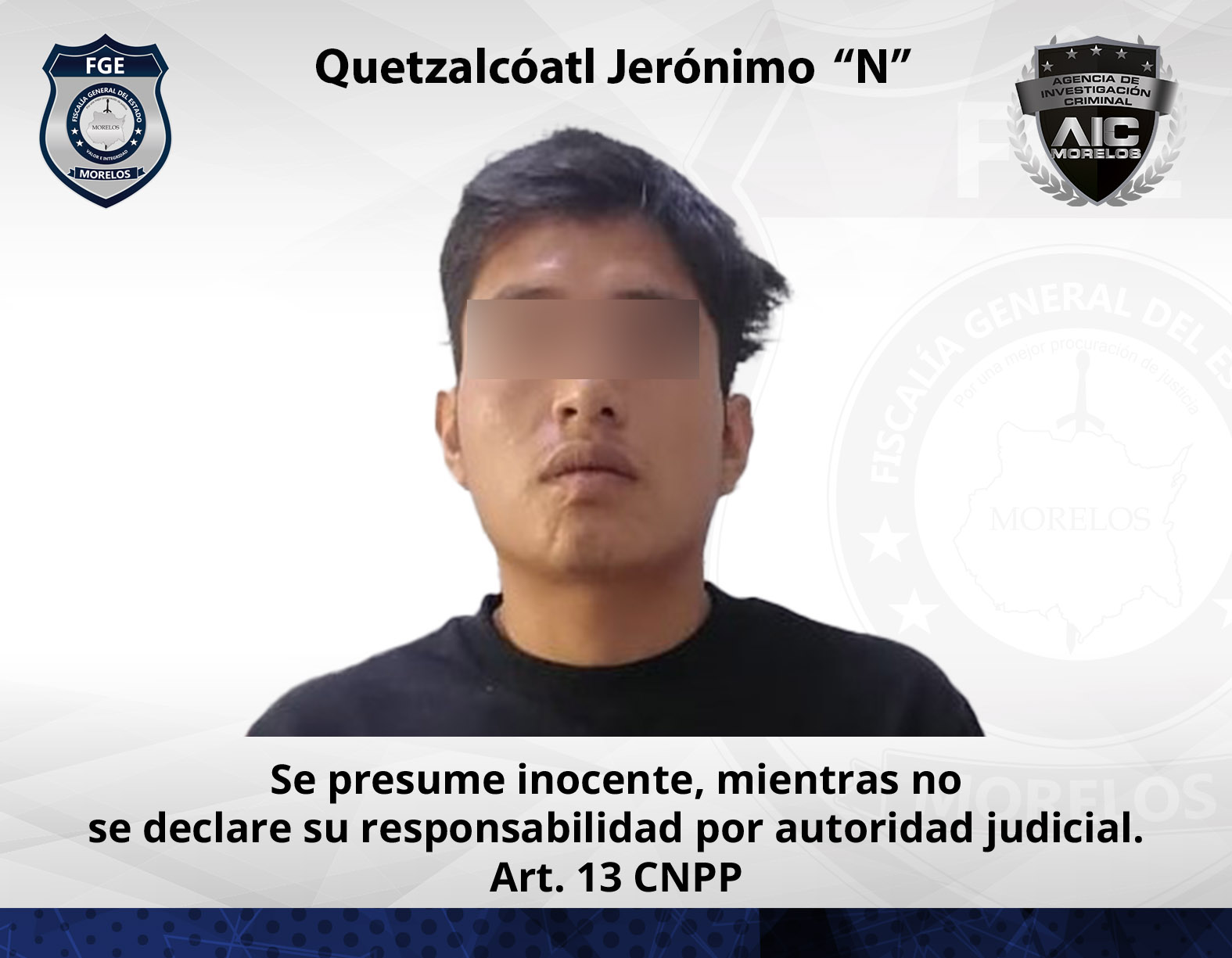 Este martes el Ministerio Público con apoyo de elementos de la AIC, Servicios Periciales y de la Guardia Nacional realizaron la intervención del inmueble en donde encontraron en una de las habitaciones a un masculino quien amenazó a los agentes al tiempo de buscar algún objeto en un mueble, por lo que fue asegurado quien se identificó como Quetzalcóatl Jerónimo “N” de 23 años de edad.