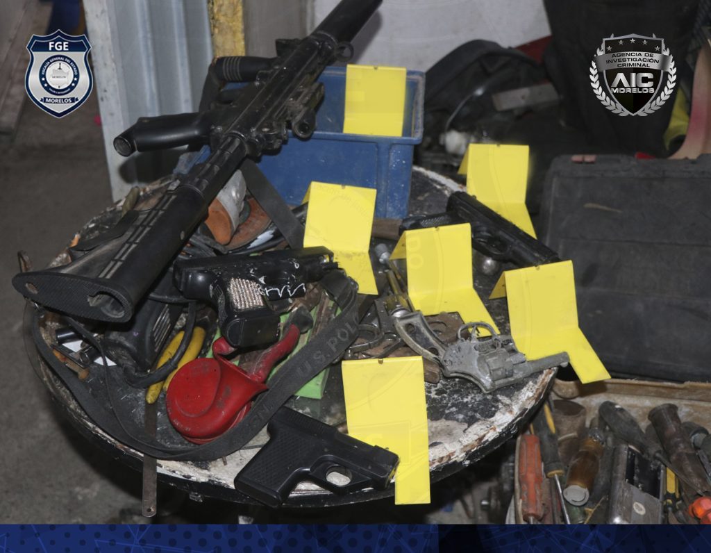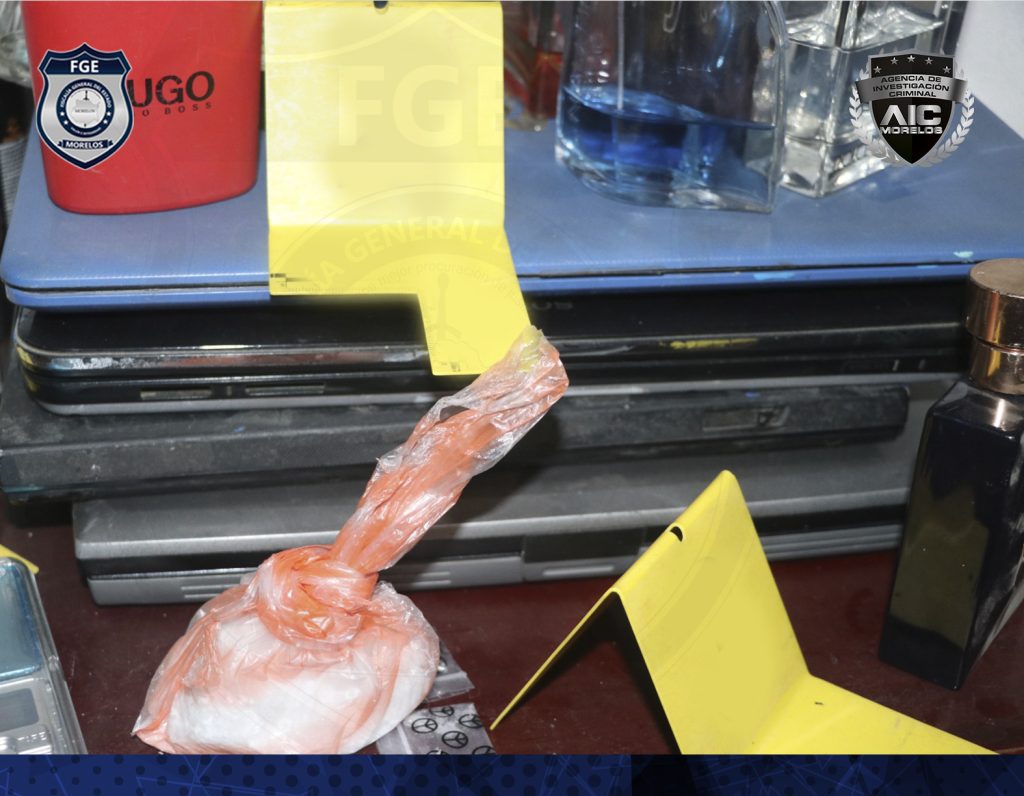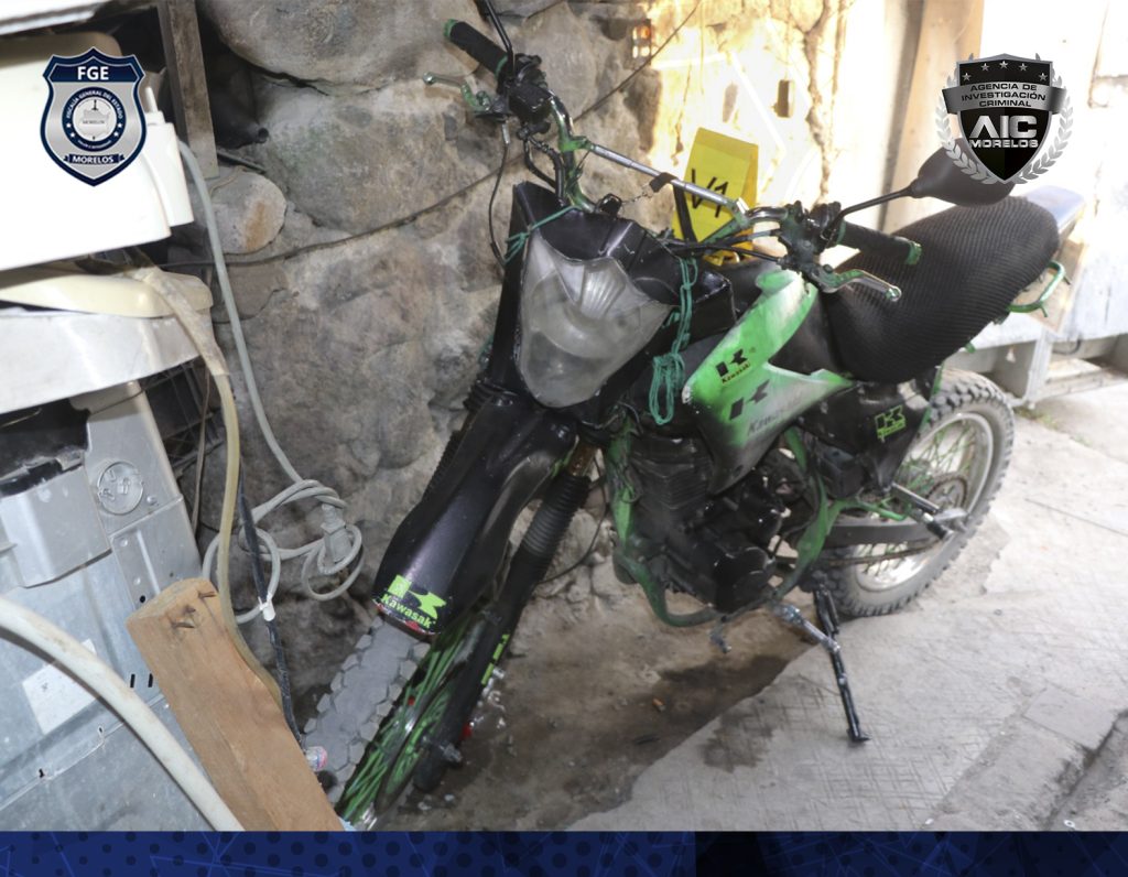 En el interior del domicilio, personal de la Coordinación General de Servicios Periciales encontró una báscula digital; 13 cartuchos; diversas bolsas con material cristalino; seis objetos similares a tipos de armas de fuego, así como una motocicleta marca Kurazai, color verde con negro, con permiso del estado de Guerrero, entre otros indicios debidamente identificados y asegurados.